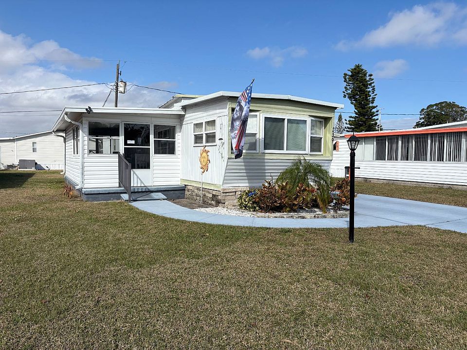 Affordable 2-bedroom, 1.5-bath mobile home located in Lakeview Estates, an active 55+ community. This move-in-ready home features new wood-look vinyl flooring, new windows, and fresh interior paint throughout. The open kitchen flows seamlessly into the living area and spacious Florida room, offering an ideal layout for both everyday living and entertaining. A split-bedroom floor plan provides privacy and comfort. Both bathrooms have been updated, and the home includes an indoor washer and dryer for convenience. Enjoy an extra-large carport with ample parking and a storage shed for additional space. The roof and AC have been updated, providing peace of mind for the new owner. Low lot rent of $1,105 includes access to a large community pool and a variety of planned activities. Conveniently located near beaches, shopping, dining, and medical facilities.
