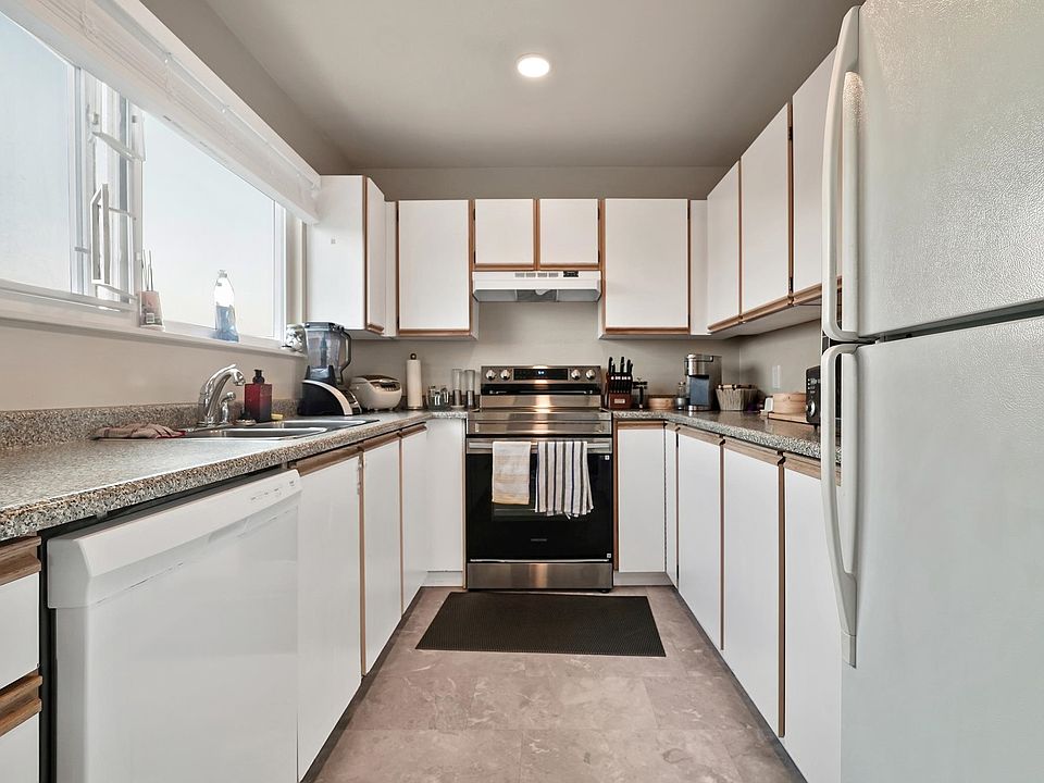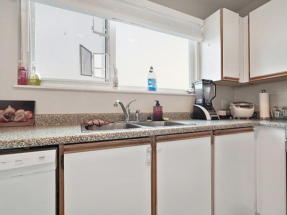 New venetian faux-wood blindsUpdated windowsSpacious kitchenNewer stoveHood fanLots of cabinetryBright window