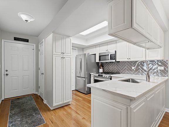 Quartz countertopHerringbone backsplashPrivate patioBright open layoutGleaming hardwood floorsModern kitchenNewer windows