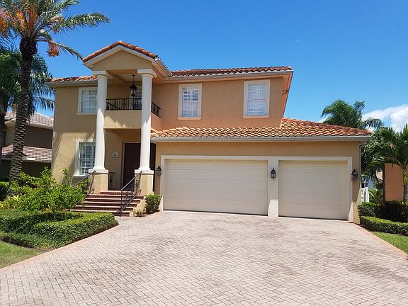 Gorgeous 4 bedroom, 2 story located in the exclusive waterfront community of Symphony Isles. The massive 2 story screen cage covers the pool, spa, lanai and observation deck overlooking your private dock with 10,000 lb lift. Room for a second lift to be added and dock just updated with Trex decking. Outdoor living space includes sitting area with a tv and a pool bath with outdoor shower. Kitchen features stainless steel appliances and bar/island. Master includes 2 walk-in closets with built-ins and a balcony overlooking the water. Master bath with dual sinks, garden tub and large multi-head shower. Family room with plenty of built ins and a window seat. Office/study overlooking canal on 2nd floor. The entire home features crown molding and plantation shutters. 3 car garage with tandem 4th bay. Sail into the sunset from your own backyard.