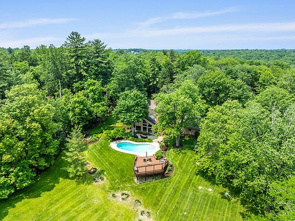 Welcome to your private Indian Hill estate: an extraordinary 5+ acre retreat with a pool, four-stall horse barn, and direct access to the Indian Hill Bridle Trails. Soaring wood-paneled vaulted ceilings, skylights, and dramatic floor-to-ceiling windows define the show stopping great room, centered around a stone fireplace. The chef's kitchen is a masterpiece, with granite countertops, 10 gas burners, beautiful cabinetry detail and skylights. The sophisticated two-level primary suite offers a vaulted ceiling, a spa-like bath and a private area above the bedroom for extra closet space or a reading nook. Three additional bedrooms and two full baths on this level. The lower level is built for entertaining with a full wet bar, family room, spacious rec space and built in sauna. Outside, unwind on the paver patio or expansive deck, surrounded by serene views of your expansive grounds and private pool.