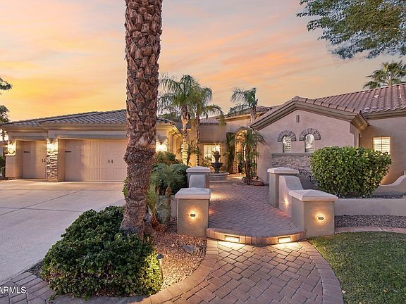 ABSOLUTELY STUNNING home w/4 bedrooms, 3.5 bathrooms & 3-CAR GARAGE. This location is PRIME - close to the 4 corners & situated on a large PREMIUM N/S lot overlooking a desert wash w/an AMAZING MOUNTAIN VIEW. As you drive up, notice the mature lush landscaping w/paver WALKWAY/PORCH, stacked stone accents, decorative walls, SPECTACULAR IRON front door, water feature & extra driveway w/double gate (beautifully lit up at night). Step inside & you will feel like you are in a model home. BEAUTIFUL CONTEMPORARY tile flooring in all the right areas plus upgraded carpets in the bedrooms, large baseboards, CUSTOM window coverings & shutters & GORGEOUS LIGHTING throughout. This home was totally enhanced in 2022 w/PURE LUXURY amenities & has been meticulously maintained. The GOURMET CUSTOM KITCHEN features LEATHER GRANITE countertops, oversized breakfast bar/island, SS WOLF GAS 8 BURNER RANGE w/SS hood, WOLF convection microwave & oven, SUB-ZERO refrigerator, COVE dishwasher, CUSTOM staggered hickory raised panel cabinets w/larger crown molding, soft close doors/drawers, spice rack, rollouts, recycle center, DESIGNER backsplash, black farmhouse sink, pot filler, pendant/under counter & over cabinet lighting & reverse osmosis. You will love the eat-in kitchen & great room area w/large windows & double French doors that deliver an abundance of natural light plus surround sound for you to enjoy your favorite music. Oversized primary suite w/sitting area, double French doors CUSTOM BATHROOM boast a huge shower w/double heads & sprayer, double vanities w/leather granite & framed mirrors, spa tub & closet with built-ins. Two other full bathrooms are highly upgraded as well. Step outside to an AMAZING RESORT OASIS an ENTERTAINERS DREAM - large pool w/3 fountains & spa, extensive amount of lighting, pavers & travertine, fire pots, built-in stacked stone BBQ w/2 side burners, bar area & lighted cabana, stacked stone fireplace gas & wood, bench areas w/cushions, mister systems, spacious covered patio w/tile & TV, grass & beautiful landscaping accented w/palm trees that offers a picturesque setting for relaxation & entertaining. The 3-car garage w/epoxy floors, extra lighting, built-in cabinets are ideal for storage. No detail has been overlooked in this DREAM HOME.