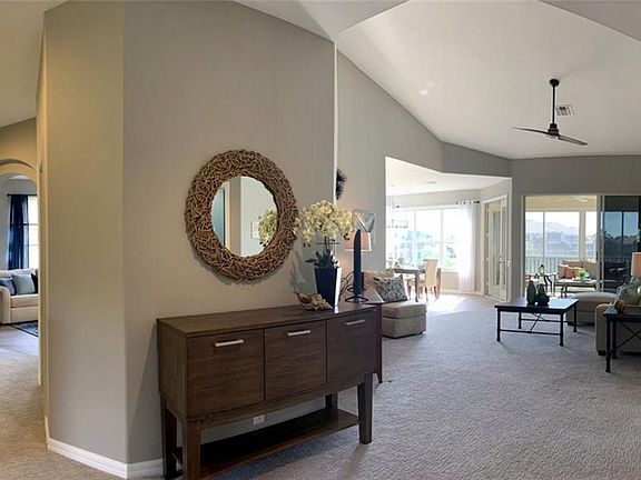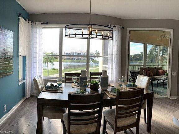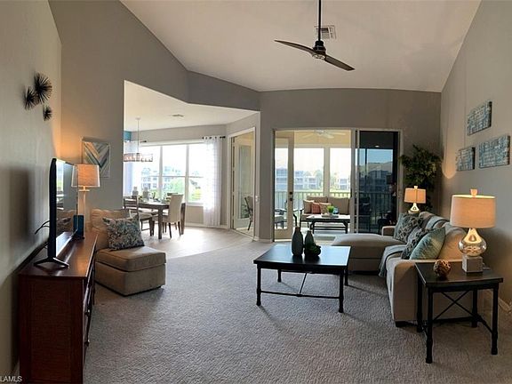 Spacious 3 bed/2 bath "Newport" carriage home has 2111 sq. ft living area with a single car garage and overlooks the 13th fairway! Lovely light and bright end unit features 2018 laminate wood like flooring in the entry, kitchen and dining rooms along with 2018 newer carpet in the bedrooms! Kitchen has 2018 Stainless Steel appliances, and a casual seating room which can also be used as a breakfast area! 2018 freshly painted carriage home has an enclosed lanai with acrylic sliders where you can view the spectacular sunsets! Other features include 2019 epoxy flooring in the garage, a 2011 A/C, a 2010 hot water heater, vaulted ceilings and a separate laundry room! Golf membership included, annual fees apply!