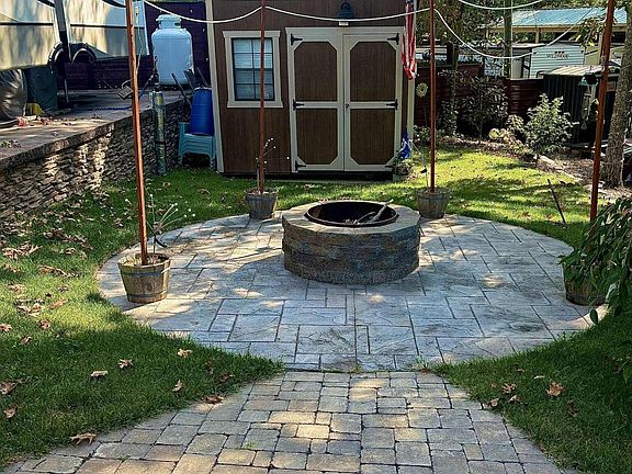 Lot 2 - Features a fully insulated storage shed with 30-amp power, plus a custom firepit, perfect for entertaining and relaxing evenings.