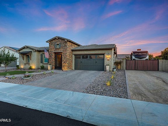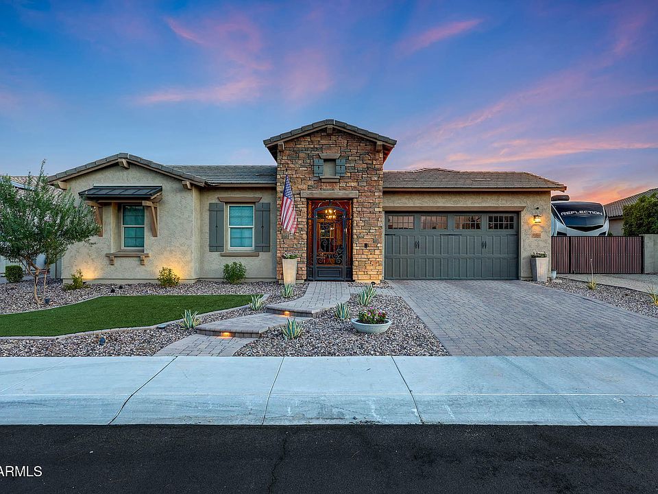 Sought-after Cholla model in the highly desirable Meadows subdivision! This spacious home features 4 bedrooms plus an office/den, a versatile game room, and 3 full bathrooms. Enter through a private courtyard and step into a gourmet kitchen with beautifully painted cabinetry, quartz countertops, a large island with breakfast bar, gas range, and double ovens. The kitchen opens to a large living room accented with shiplap, faux wood beams, and a large slider for seamless indoor/outdoor living. A formal dining room with an elegant electric fireplace adds charm and warmth. Brand new carpet has been installed throughout. The luxurious primary suite includes dual raised vanities with quartz counters, an oversized shower, and a custom walk-in closet with built-ins. Bedrooms 3 and 4 share access to a separate game room, creating a perfect retreat for family or guests. Step outside to your backyard oasis, complete with a refreshing play pool featuring a baja shelf, built-in table, and soothing water feature. Entertain under the Alumawood pergola and gazebo, enjoy evenings by the wood-burning fireplace, and relax in a beautifully landscaped setting with artificial turf and lush greenery. This home also offers a rare 18-foot RV gate with community-approved RV PARKING, plus a 3-car tandem garage with epoxy flooring and side exit. The Meadows is one of the area's most sought-after communities, offering parks, greenbelts, and a welcoming neighborhood atmosphere.