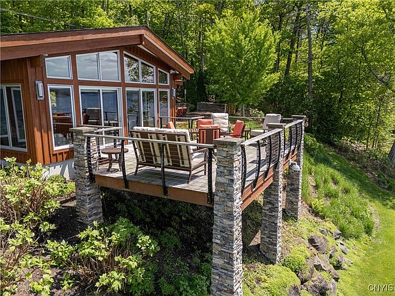 Spectacular Seneca Lake year-round estate with 248 feet of fully developed waterfront and beach, nestled on the coveted eastern shoreline amid wineries and vineyards. This extraordinary thoughtfully designed 4 acre property features a custom built 4 bedroom Transitional home with sweeping lake views; an additional 525 sqft lakeside Guest house, 3 car detached garage, multiple decks and stone patios perfect for entertaining, plus two substantial permanent docks functional for multiple boats, with an area for social gatherings. The main house offers an open floor plan with unparalleled views from entry to lakeside. The cook's kitchen serves to anchor the main level with 2 massive granite topped islands, high end stainless appliances, including: commercial 8 burner Wolf stove with hood, built in refrigerator and matching wine cooler, refrigerator drawers, and more. Inlaid Cherry cabinetry provides elegant storage in this beautiful, but purposeful area. The kitchen opens to a lakeside dining area with a "wall of glass" and also to a living room with stone fireplace separated by glass pocket doors to preserve water views. Continuing the hand-crafted use of natural materials like exposed wood beams accenting soaring ceilings and stone fireplaces, the expansive Great room does not disappoint; oversized windows and sliders offer up both lake views and access to the sizable stone patio with sunken hot tub. This level also presents a private primary suite with fireplace, spa-inspired bath and access to its own patio. Additionally, a secondary suite, and 2 more bedrooms complete this floor. The lower level features a theater / rec room, large storage / wine "cellar", and utility area. The guest cottage located just a few steps from the shoreline has its own lake presence with a private deck, open kitchen / Great room with high end appliances and finishes, bedroom plus sleeping loft, and full bath. This special Seneca Lake property is truly a one of kind destination home. Sqft of 3907 reflects recent, attached floor plans, does not include the guest house of 525sqft.