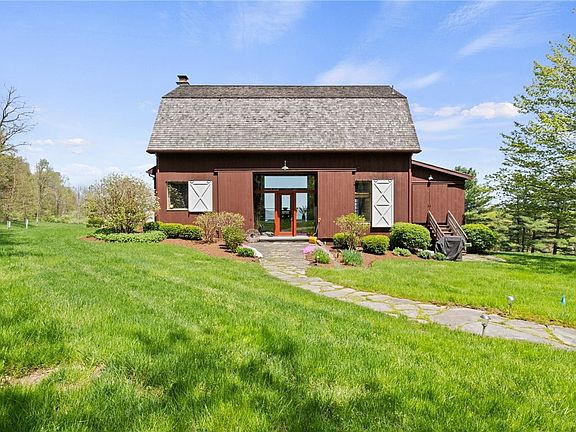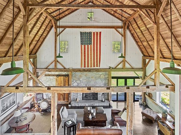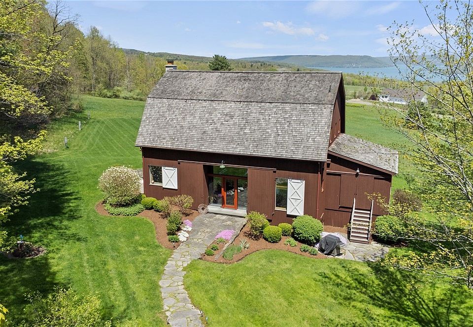 Set on 29 acres with some of the most iconic views of Keuka Lake and the Bluff, this 2,650-square-foot home is a masterpiece of craft and imagination. Originally built in 1871, the barn was carefully dismantled on the east side of Keuka Lake and re-raised here by Mennonite craftsmen. The result is a soaring residence where original timbers support a ceiling nearly 30 feet high, walls of glass capture sweeping views, and an open floor plan blends rustic character with contemporary design.