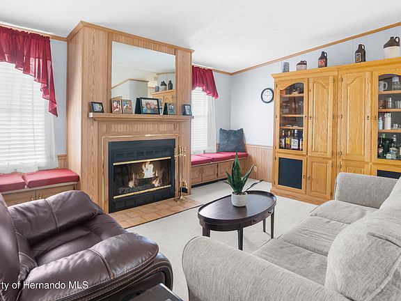A pristine, move-in ready home in a gated 55+ community with tons of amenities? No, you're not dreaming, it's your dream home come to life! This Palm Harbor-built mobile home in highly desirable Brookridge is beautiful inside and out, starting with the low-maintenance xeriscaped lawn. Inside, the split-bedroom floor plan comes furnished and is fully turnkey! It's both expansive and functional, with vaulted ceilings adding volume to the space. A wood-burning fireplace flanked by two cushioned window seats creates a cozy focal point in the living room. The kitchen is bright and open with lots of cabinet and counter space, a breakfast bar, pantry, and a large eating nook. Skylights gently illuminate the luxury vinyl plank flooring here, which extends into a big family room. It's a great spot where everyone can gather for game or movie night. Retreat to the primary suite after a long day of golfing and socializing at the clubhouse; it's private with a large closet. The ensuite primary bathroom offers dual sink vanities and a walk-in shower. The other two guest bedrooms are also quite sizable; one of them has extensive built-in shelving, expanding your storage capacity. They share a guest bathroom with a tub/shower combo. An indoor utility room provides easy access to the washer and dryer. A newer wooden ramp leads out to the covered carport, where the workshop and storage area await. Here, you'll find a workbench and a roll-up garage door that allows you to effortlessly park your golf cart inside. Brookridge is a premiere 55+ gated community filled to the brim with amenities, including 24/7 security, a golf course, clubhouse, community pool, and a variety of sports courts, like tennis, shuffleboard, and bocce ball. Additionally, there's numerous clubs and activities to join for those who enjoy an active, social lifestyle. It's close to a plethora of shopping and dining options in the nearby plazas, plus medical facilities, parks, and more. Weeki Wachee Springs State Park is only 20 minutes away, where you can paddle the river, meet real mermaids, and enjoy the waterpark in the summer months. The Suncoast Parkway is literally moments away, so Tampa and attractions like Busch Gardens, Raymond James Stadium, and the Hard Rock Casino are only about an hour to the south. And the magic of Orlando's theme parks lies less than 2 hours to the east. Private tours are available! Whether you're seeking a seasonal escape from cooler climes or a full-time fun spot to call home, you shouldn't miss the chance to live the Florida lifestyle you deserve. See this home today!