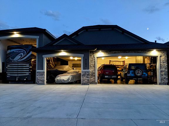 Better than New ! This Heated DREAM 6 Car Garage offers a 45 foot RV Bay with 30 amp & 14 ft tall door, 33 ft deep 3rd bay & 25 ft deep double bay! Built-in cabinets and beautiful epoxy floors with room for all of your toys! 11x7 storage shed in back, gas fire pit, TV bracket and speakers on the patio plus room for a hot tub. Beautifully landscaped with mature trees and fully fenced with vinyl fencing. Enjoy the trails at the base of the Eagle Foothills & what this farm to table community has to offer. This gorgeous Single level home welcomes you with Stainless Steel black appliances, Stone floor to ceiling fireplace, nice large windows for lots of natural light, a very spacious great room & beautiful wood floors throughout. Enjoy the 2000 sq ft community center & clubhouse w/pool, playgrounds & parks.