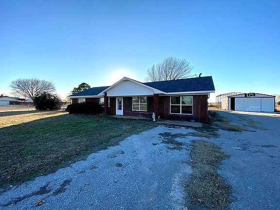 This 4/3 brick home on 2.5 acres has 2 master suites. Large living room. Granite counter tops. New roof 2020, new exterior paint 2021, new HVAC system 2017. 24’x30’ metal building, 24’x12’ metal building equipped with six pens for showstock. Pipe fenced pen with covered shed. 8’x10’ storm cellar. Conveniently located 2 miles west of exit 15 off I-35. Centrally to Dallas and Oklahoma City.