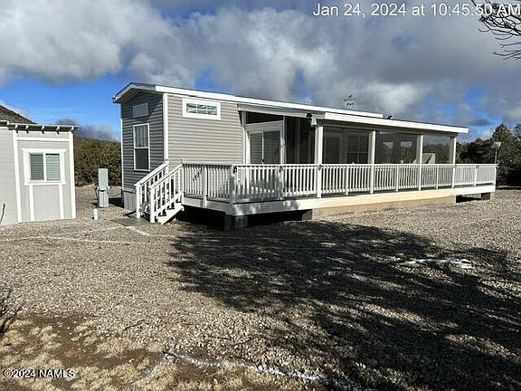 This 9.794-acre property is beautifully treed with juniper and pinon trees. The level lot features a 2022 399-sq ft, Park Model Cavco. The fully furnished home has a large screened-in porch plus deck with ramp access. There is also central AC, electric shade on sliding door, electric fireplace.