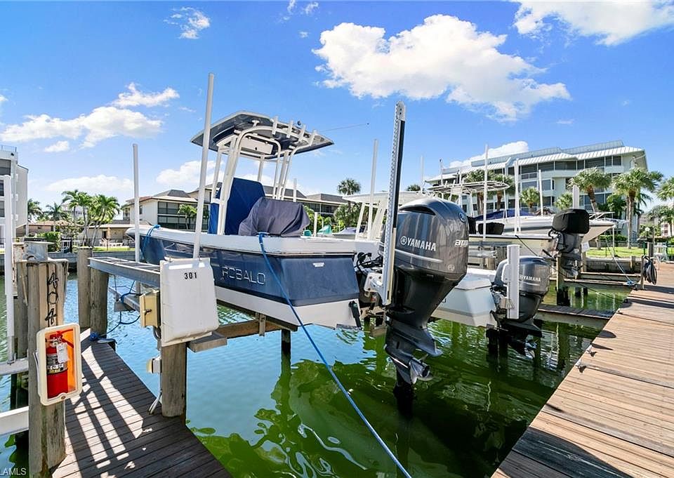 Welcome to your boating oasis at Pelican Perch! This charming 2-bedroom, 2-bathroom condominium offers the quintessential Marco Island lifestyle: short distance to the beach, ample sunshine, and access to the Gulf via one of Marco's iconic canals. The purchase of this unit includes a highly valued deeded boat dock (dock #4, marked 301), and the canal boasts direct access to beautiful Island waterways. Step inside and take in the spacious floor plan featuring tile flooring throughout the main living areas, including the kitchen, dining room, living room, bathrooms and lanai, while the bedrooms are comfortably carpeted. The kitchen is equipped with updated appliances that will help make meal prepping a breeze. The home also includes an updated hot water heater (2024) for peace of mind, and the convenience of an in-unit laundry with shelving. The primary bedroom offers a true retreat, and includes a walk-in closet and private access to the screened lanai, where you can enjoy serene views of the canal. The en-suite primary bathroom features dual sinks, providing ample space and comfort. Laid back Island life becomes even easier with covered assigned parking under the building. Residents of Pelican Perch enjoy a variety of community amenities, including a refreshing community pool adjacent to the canal, a barbecue and picnic area perfect for outdoor gatherings, secure bike storage, and an elevator for easy access. Experience the best aspects of Marco Island living with this exceptional condominium. Schedule your showing today!