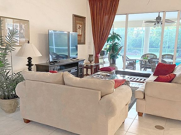 Welcome to your perfect retreat in the picturesque Northeast corner of Lehigh Acres. This beautiful single family home, previously used as a popular vacation rental with several regular guests is now available for your seasonable or year round enjoyment. Spanning 2,100sqft,, this home features three spacious bedrooms and two modern bathrooms, making it an excellent choice for families with kids or as a vacation rental. The interior is beautifully decorated. The high ceilings create an airy and inviting atmosphere that is ready for you to move into. Step outside to find a large, sparkling pool and spa a fantastic yard, perfect for relaxing and entertaining. The neighborhood is filled with charming single family homes, ensuring a peaceful and welcoming environment. Whether you're lounging by the pool or hosting family gatherings you'll love the stunning sunsets that paint the sky each evening. Don't miss this opportunity to own a slice of paradise in Lehigh Acres - your dream home awaits!