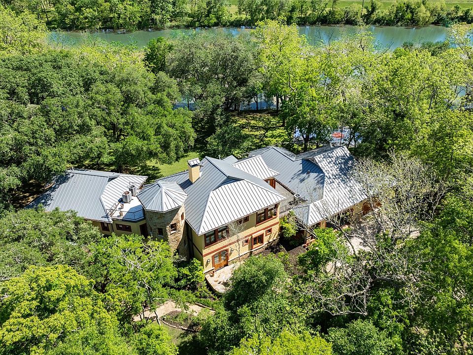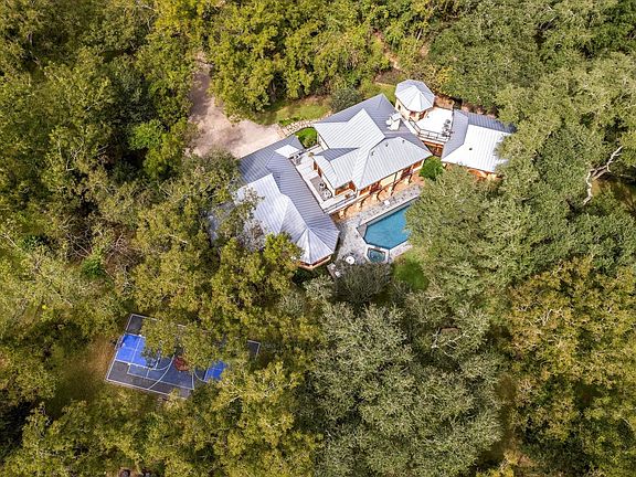 Set within a natural landscape of majestic oaks and an oxbow lake, this 6-bedroom home with pool/spa on 2.265 acres is a true gem. Designed and built by a renowned international architect, the home artfully blends Hill Country elements of bold stone accents and a striking metal roof with soft South American arches and colors to create a warm and inviting hacienda vibe with Texas flair. Rich Honduran mahogany doors and windows featured throughout foster an effortless indoor/outdoor flow, perfect for comfortably enjoying nature. Balconies, natural light, distinctive hardware and imported wood and tile floors elevate the charm of this unique home. Other features include an elaborate library featuring stained glass, expansive family room with lake vistas, impressive winding staircase, extended stone patios and hardscaped pathways, outdoor kitchen, 30’x60’ tiled sport court, and a 4-car garage with workbench, lift-ready raised ceiling and built out upstairs.