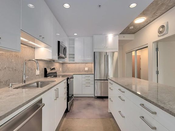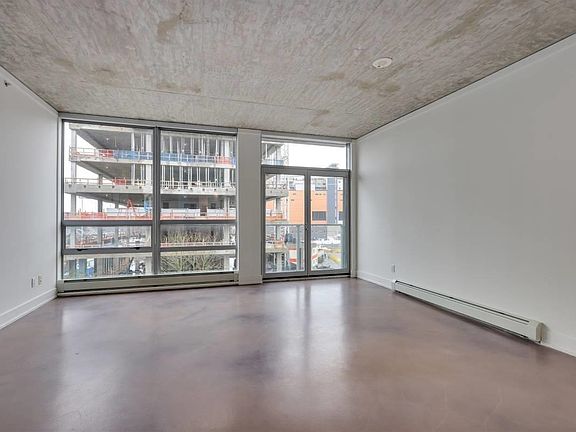 Welcome to this bright and spacious east-facing corner suite in the highly desirable Left Bank building. Boasting floor-to-ceiling windows and 9' exposed concrete ceilings, this home offers an airy, modern loft aesthetic with an abundance of natural light flooding every room. The open-concept layout features polished concrete floors and a fully updated kitchen complete with quartz countertops, sleek stainless steel appliances, and custom tile accents ideal for those who appreciate minimalist, contemporary design. The generously sized primary bedroom comfortably fits a king-size bed and offers a private ensuite bathroom, as well as direct access to a private patio perfect for enjoying your morning coffee or winding down in the evening.