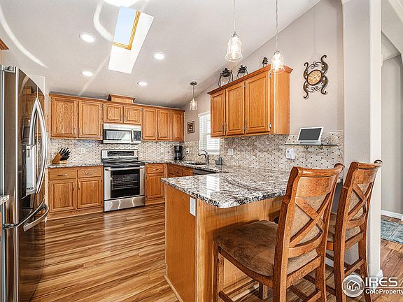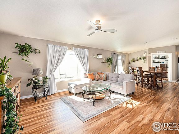 Welcome home to one of the nicest homes in one of the premiere 55+ communities in all of Northern Colorado! Upon coming through the community gates, you will find an active community with pickleball courts, a hot tub, a community exercise area, a pitch & putt golf area and so much more! This wonderfully updated home is absolutely turn key! There is a covered porch in the front and you enter into a warm living room with new Cortec flooring throughout the home. The kitchen boasts plenty of cabinet space, stainless appliances, granite countertops and skylights that provide a ton of natural light. There is a study/office which can be used as third bedroom (if needed). The primary suite is a peaceful oasis as the door from the kitchen to the laundry area has been sealed off, giving complete privacy! Outside there is a large concrete patio and 2 electronically controlled awnings for plenty of shade and they have wind sensors that can automatically retract so as not to damage the system. The air conditioning system has also been updated. In the attached oversize garage, there is plenty of storage and the shelving will stay.