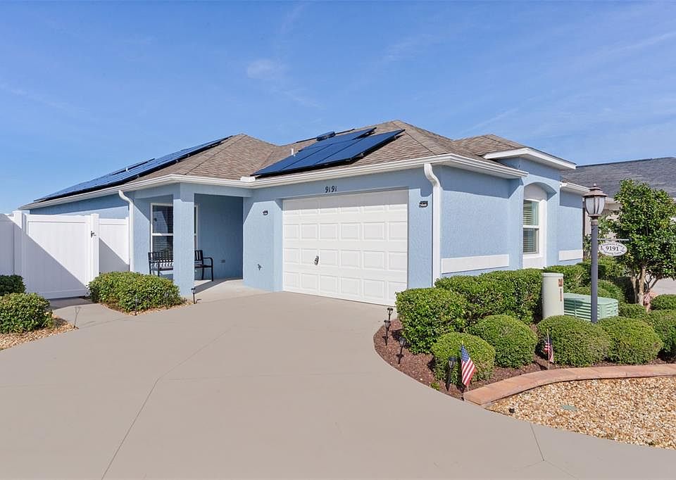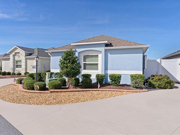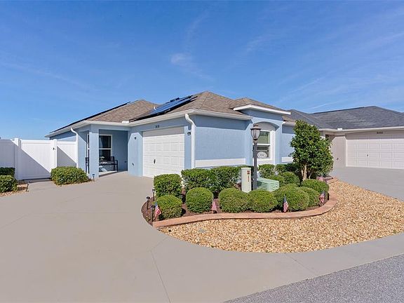 ~BUILT IN 2016~ ~114 SQ FT GLASS ENCLOSED LANAI UNDER HEAT & AIR~ ~SELLER OWNED SOLAR PANELS~ ~2025 HVAC~ ~2024 Hot Water Heater with Rheem Heat Pump~ Beautiful 2/2 DURHAM model Courtyard Villa in the Village of WOODBURY, PHILLIPS VILLAS! This home provides a spacious OPEN FLOOR PLAN and numerous upgrades throughout. As you enter you are greeted with HIGH VAULTED CEILINGS and LUXURY VINYL PLANK FLOORING for a bright, airy feel. The living room features a ceiling fan, and the dining area shares the same soaring ceilings. The kitchen is a showstopper with QUARTZ COUNTERTOPS and BACKSPLASH, stainless-steel appliances, recessed lighting, roll-out lower cabinets, and a CLOSET PANTRY. The primary suite boasts a TRAY CEILING, ceiling fan, WALK-IN CLOSET, and a beautiful ensuite bath with PORCELAIN TILE, a GORGEOUS TILED WALK-IN SHOWER with NEW GLASS DOORS, and tall cabinetry with QUARTZ countertops. The guest bedroom also features vaulted ceilings, a ceiling fan, and a built-in closet, while the guest bath includes a TILED WALK-IN SHOWER with NEW GLASS DOORS, porcelain tile, linen closet, and QUARTZ counters. Relax year-round in the GLASS ENCLOSED LANAI under HEAT AND AIR or open the telescoping sliders to the BIRDCAGE with COMPOSITE DECKING and BLINDS for outdoor enjoyment. The lanai features a ceiling fan and provides a seamless blend of indoor and outdoor living. The 1½-car garage includes a laundry tub, LG WASHER AND DRYER, shelving, and a SOLAR ATTIC FAN. The home has SOLAR PANELS with a 6-hour emergency battery and a POWER SURGE PROTECTOR (completely paid for). For your comfort, the Hot Water Heater kicks cold air back into the garage. This stunning villa combines comfort, style, and thoughtful upgrades—ready for you to move right in and enjoy The Villages lifestyle! Minutes from Mulberry Rec Center, First Responders Rec Center, Nancy Lopez Golf Course, and the Mulberry Shopping Center for shopping, restaurants and more.