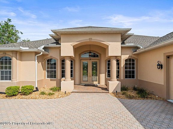 Located in Glen Lakes. Beautifully updated 2003 Addison Custom pool home on .31 acre and backing to a conservation area with pond for a very peaceful setting. NEW ROOF IN AUGUST OF 2025! 3 bedrooms+den/3 baths/2 car+golf cart garage. Large circular driveway with pavers, outdoor landscape lighting, stone bedding. The pool (16 ft. x 28 ft.) plus in-ground spa are heated by heat pump. Oversized paver pool deck can accommodate all of your entertaining needs. The paver lanai is 13 ft. x 24 ft. Twin AC units. Enter this home through double leaded glass front doors. THIS HOME HAS A SELF-CONTAINED IN-LAW SUITE with a bedroom/full bath (shower only)/full kitchen/family room with murphy bed and both a door and sliding doors to the pool area. This area also has its own thermostat. Off of the in-law suite is the 2nd bath and 3rd bedroom. High flat ceilings throughout, engineered hardwood in bedrooms/formal dining room/den and 18 inch tile elsewhere. Great room with 3 sliders to the pool area/wet bar with wine cooler/electric fireplace/crown molding. The formal dining room has double glass doors and the den off of the great room also has double glass doors and lots of built-in cabinetry. The primary suite has double door entry, a sitting area, a door to the pool area, double crown molding with lighting, twin walk-in closets, a walk-in shower, jetted soaking tub, double sinks with granite counters and separate vanity area with granite. The breakfast area is large (10 ft. x 12 ft.) and windows overlooking the lanai/patio/pool. The kitchen has beautiful granite counters, white cabinets, closet pantry, LG stainless steel appliances. The laundry room is 6 ft. x 15 ft. and has a sink, included washer and dryer and loads of storage cabinets. This is a light and airy house and move-in ready. 3141 living sq. ft., 4275 total sq. ft. HOA FEES INCLUDE CABLE AND HIGH SPEED INTERNET AND PRIVATE MAINTAINED STREETS, 24 HOUR SECURITY WITH MANNED GATE. Glen Lakes is a wonderful gated and manned golf course community and surrounded by the 85,000 acre Chassahowitzka National Wildlife Refuge. The required social membership gives access to the clubhouse, restaurant, bar, Jr. Olympic size heated pool/spa, fitness center, clay tennis courts, pickleball courts and a vast array of social clubs. Golf memberships also available.