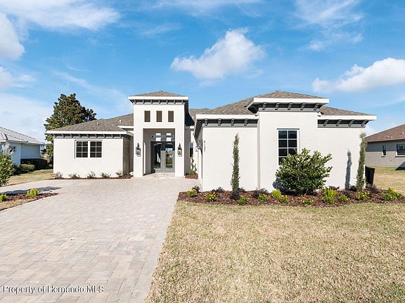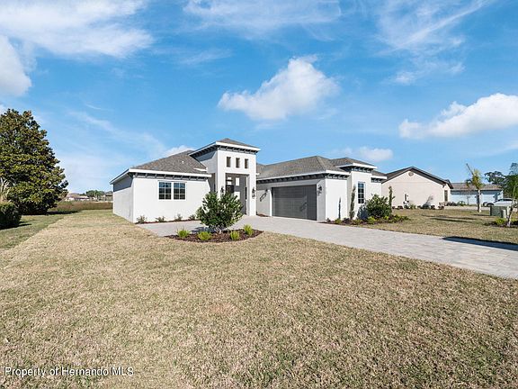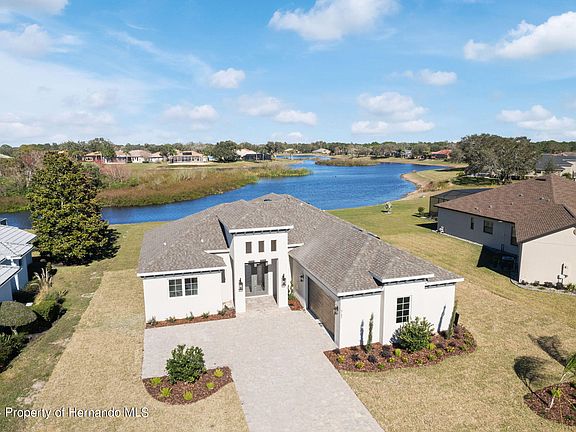 Active Under Contract - Accepting Back Up Offers. One look at this gorgeous new build in upscale Glen Lakes will have you believing in love at first sight! Completed in 2024 by ARC Florida Homes, this Santa Barbara model backs up to the spring-fed lake that surrounds Bird Island - stunning views and privacy are yours with no rear neighbors. Brick pavers line the drive and the walkway; enormous eight-feet doors swing open to reveal a wide, grand foyer. The open-concept, split-bedroom floor plan was designed with both form and function in mind, allowing for all the space you need to entertain or relax as you desire. Upgraded features, like soaring tray ceilings, recessed lighting, quartz and granite counters, designer light fixtures, and luxury vinyl plank flooring throughout, augment modern living. Home cooks will absolutely obsess over this kitchen with Samsung stainless steel appliances, including a built-in oven and microwave and a flat cooktop with a hood vent. There's a stylish herringbone pattern in the tile backsplash, tons of cabinet and counter space, and a pantry for storage. Belly up to the breakfast bar in the morning and nibble your bagel, or take your coffee over to the large eating nook, which overlooks the water outside. The end of a long day calls for a retreat to the spacious primary bedroom, which has two large walk-in closets. The ensuite primary bathroom is simply sumptuous, with dual sink vanities, a feature soaking tub, and marble-look tile in the huge walk-in shower and on the floor. The rest of your family and visitors will enjoy their space comfortably in the remaining guest bedrooms; they share two guest bathrooms with large showers. An indoor laundry room with a sink and additional cabinet storage provides transitional entry from the garage to the main house. Massive glass triple sliders in the great room lead out to an extended covered lanai, where you can lounge with a pitcher of sweet tea or lemonade when the weather is fair, taking in the lake out back. Oh, and there's definitely plenty of room for your dream pool if you decide you'd like to add one. Glen Lakes, a premier gated community with 24-hour security, was named Reader's Choice for Best Golf Course Community by the Hernando Sun in 2023! The monthly HOA fees include basic cable and internet. Along with your social membership, you'll have access to incredible amenities, including a country club; championship Ron Garl-designed 18-hole golf course; pro shop; full restaurant and bar; a newly renovated clubhouse; billiards room; fitness center; heated junior Olympic community pool; tennis, bocce, and pickleball courts; and more! Additional golf memberships are available to purchase. This community adjoins the 85,000-acre Chassahowitzka National Wildlife Refuge, and is less than 5 miles away from Weeki Wachee Springs State Park, where you can discover the magic of real mermaids and the natural beauty of the Adventure Coast. Popular swimming destinations like Roger's Park and Pine Island are a short trek away. Conveniently located just off of US-19 (Commercial Way), you've got easy access to Homosassa, Tarpon Springs and the sponge docks there, and the gorgeous white sand beaches of Clearwater. Ready to fall head over heels? Swipe right - reach out and schedule your appointment to view today!