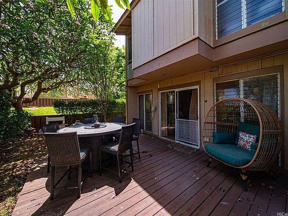 An end-unit townhome with a wrap-around yard space + fruit trees? Opportunity galore in this sought-after Makakilo townhome with a single family home vibe. This spacious 3-bedroom has 1-full bath and 1 half bath downstairs, which is perfect for guests and everyday living. Two side-by-side parking stalls are located right out front (easy Costco runs). The large yard surrounding the home offers lots of space for activities, relax outdoors, host BBQs, work on projects or build upon the existing tropical garden oasis. Already, the yard features a mature fig tree, lemon, coconut, and banana trees, plumeria, hibiscus, lobster claw heliconia plants and more. Makakilo, meaning 'observing eyes' in Olelo Hawai'i (Hawaiian), offers cooler temps, amazing star-gazing views, and gentle breezes thanks to its higher elevation. On hotter days, head to the Palehua pool and playground for a refreshing break. This home is just a short drive to the H-1, tons of shopping, dining & entertainment in Kapolei and the beaches in nearby Ko'Olina. This home offers privacy, convenience, and natural beauty.