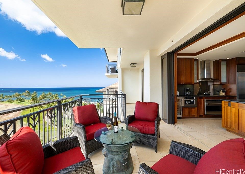 Have you been waiting for a Villa with a View in the BEACH TOWER? This is it!!! Beautifully furnished & turnkey LEGAL vacation rental at the Ko Olina Beach Villas at Lagoon 2. This 8th floor, 2-bedroom 2-bath Villa has panoramic ocean and beach views, along with tropical lagoon pool views. Very nice condition, neutral colors, designer furnishings, electronics and artwork. Roy Yamaguchi designed kitchen with high end stainless appliances, wine fridge, granite countertops. Travertine tiled flooring. It comes with a Covered Parking Stall. Enjoy the refreshing lagoon pools or swim laps in the heated lap pool. Relax in one of several whirlpools or in the pool water loungers. Pristine sandy beaches and tranquil lagoons are adjacent to the property. Have a cocktail at the beach bar and listen to aloha music while having a BBQ. Easy walk to golf, restaurants, shopping, marina and luau. Fees include front desk, 24-hour security, cable, WiFi, water, sewer, building insurance, maintenance, landscaping, fitness center, sauna, locker rooms. Beautiful tropical lagoon pools, heated lap pool, multiple hot tubs, barbecue grills, and a beach bar.