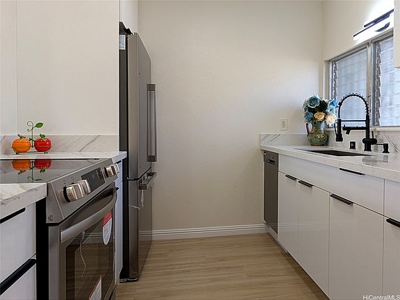 Welcome to this just beautifully and fully remodeled 2-bedroom, 1 full bath townhome located at Palehua Gardens up in Makakilo! They are New Kitchen with white high glassy, soft closing cabinets, quartz counter tops, New kitchen appliances, New bathrooms vanities with new titled shower, New luxury vinyl flooring, New interior paint, etc. This corner-end unit has a back courtyard and storage.