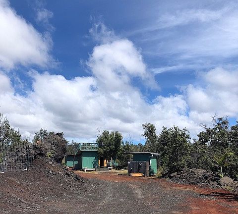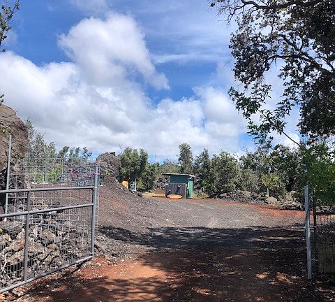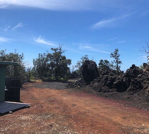 Very private, rural acre with dozing, buildings, catchment and gated and fenced. One side of acre parcel nearest road has been dozed to build a future home and lot is clearly staked. The lot is forested with native species and has numerous more recent decorative plantings. There is a tall and long volcanic berm with current improvements behind it... in this gated and fenced area. If you want to be off the grid and live off the land it is possible in this location. All amenities are available in Ocean View Town Center which is nearby via Highway 11. Check out the photos, and yes, there are ocean views.