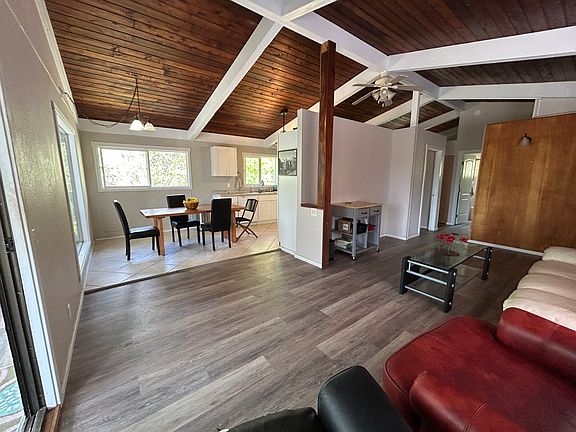 Private, gated and tucked away on 1 acre of land surrounded by lush vegetation. Main house consists of an updated 2 bedroom, 1 bath home which features vaulted ceilings, granite countertops, soft close cabinets, newer appliances, newer floors, a tiled bath and laundry room. Escape onto your screened-in lanai which is an added living space of more than 200 square feet. The inside laundry room leaves ample space to add a washer and dryer, plus room for cabinets for more storage. Private pathway extends to the back of the property where tucked away is the 2nd building with a covered lanai sits. Each house has its own separate water catchment tank and circle driveway. Great for extended family, workshop or gym! Experience the privacy this hidden gem has to offer. Property is being sold As-Is. Current TIR and previous survey available with accepted offer. No showings on Saturday. By appointment only. No Trespassing.