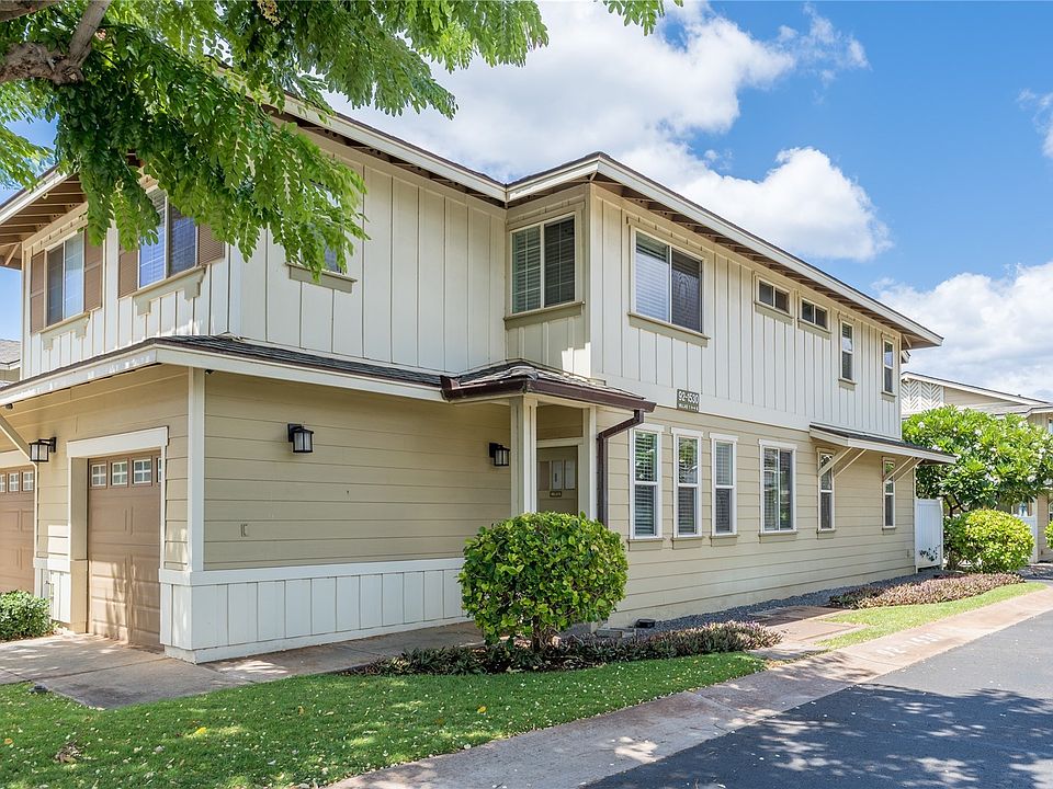 Welcome to Ko Olina Hillside Villas! Rarely available end-unit 3-bedroom, 2.5-bath townhome offering 2-story resort living—ideal as a primary home, vacation retreat, or rental investment. Features include wood cabinets, granite counters, stainless steel appliances and farm sink, tile & luxury vinyl plank (LVP) flooring, central A/C, ceiling fans, and a 1-car garage with driveway parking. New blinds throughout. The interior laundry room was converted to a spacious pantry; in the garage there is your washer and dryer, tankless on-demand water heater, and extra storage with shelving in the storage closet and an overhead garage storage rack system. Relax at the recreation center with pool, spa, BBQs & cabana, or stroll to Ko Olina’s lagoons for a swim or sunset. Enjoy championship golf, luxurious spa days, fine dining, happy hours, shopping, and snorkel cruises—all minutes away. Monthly fees include fitness classes, gym, tennis, pickleball, pools, water, sewer, landscaping, exterior maintenance & insurance—just add cable, internet & electricity. Legal 30-day rentals allowed. A true slice of paradise with lifestyle and income potential! Video link available for enhanced floor plan.