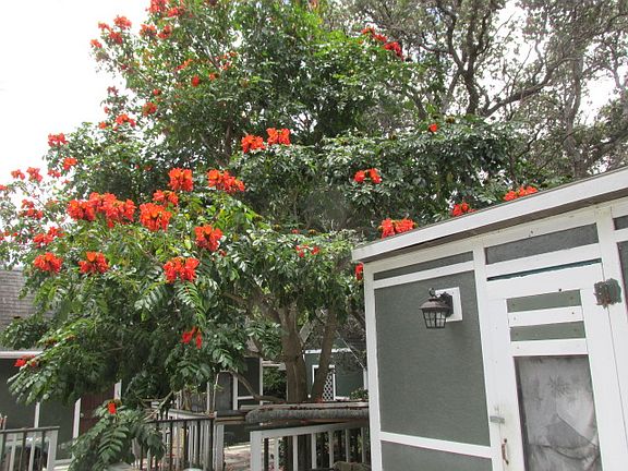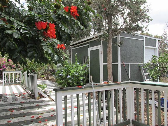 One acre parcel at low elevation with unpermitted dwelling and several outbuildings. Needs TLC but good bones. Set back from the road for maximum privacy. Years of landscaping have resulted in groves of trees and shrubs - mango, avocado, lemon and many palms and evergreens. Hibiscus and bougainvillea for color. Large ohia trees for shade. New catchment.