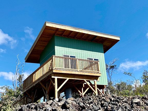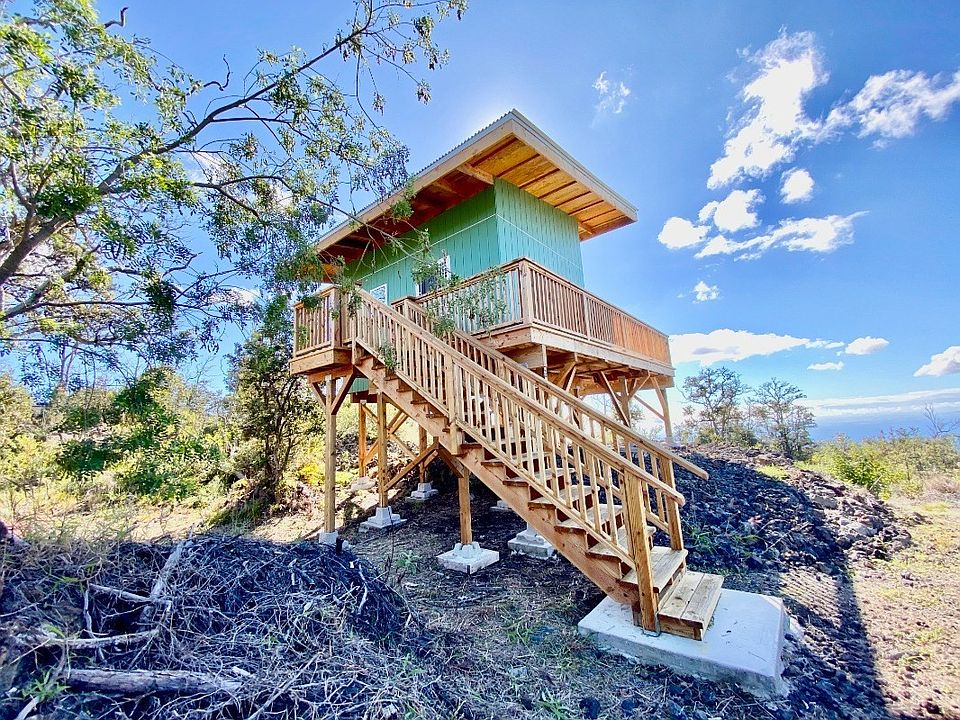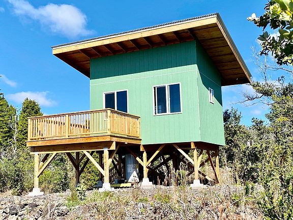 If it's private simple living you want, that's what you will get with this unique property. Built in July of 2022, this quality, professionally built, unfinished 12X16, 194 s.f., one room tiny home sits high up on a post and pier foundation to take advantage of the breathtaking ocean, coastline & Southpoint views from it's wrap around wood lanai. The local builder and designer of this home can work with you to complete and even enlarge the home to your liking. The home allows for economical off grid living and sits at the end of a beautifully cleared and graded driveway w/extensive, hand crafted rock wall work and is invisible from the street for privacy. There are multiple additional cleared and graded areas to use as you like. The 1 acre wooded property is filled with native Ohia trees and greenery located a little above the mid way point of the subdivision w/an elevation of approximately 3641. A small wooden shed and a cute out-house also on the property await your improvements. Water container on the property can be filled to provide water for gardening or personal use. Tiny home includes the following quality features: