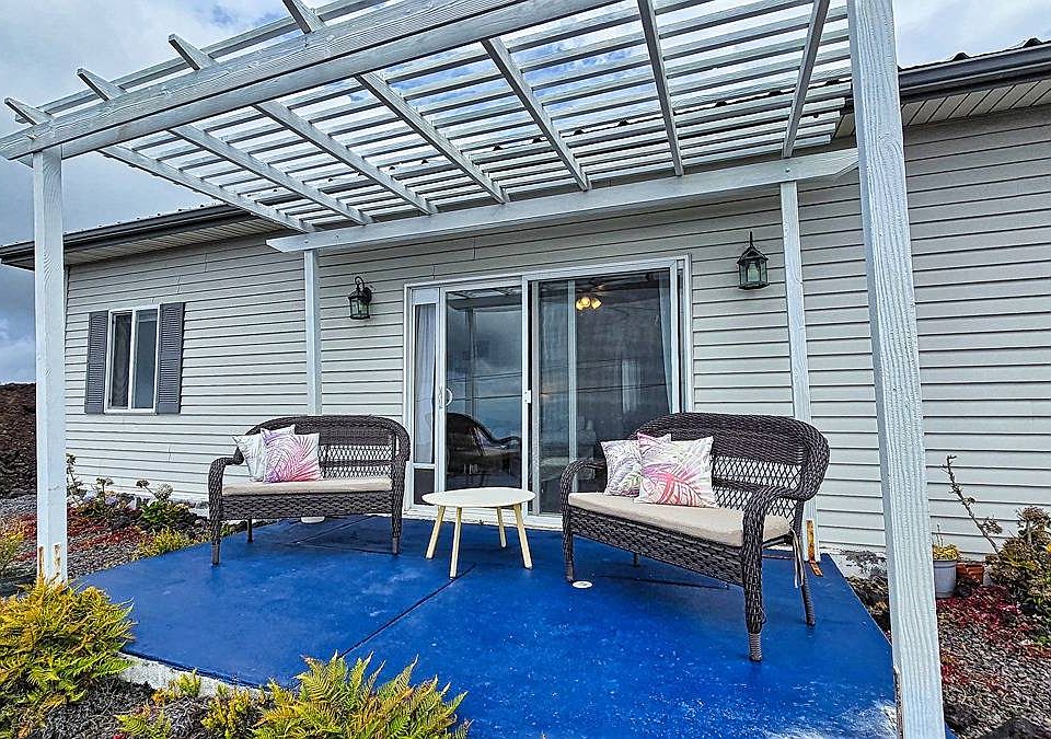Escape to serenity in this quiet and secluded home surrounded by lava hills for privacy! Enjoy relaxing on the lanai and gazing at the views of South Point, the windmills, and gorgeous sunrises and sunsets. With almost no light pollution, stargazing is incredible. This home is 1,025 sq ft and has three bedrooms and one bath. Inside, discover an open floor plan with abundant natural light. Nestled on one acre of land, this steel frame house offers the perfect blend of strength and tranquility. It also provides peace of mind with this durable steel construction, safeguarding against termites, rot, and mold. Insulation takes priority with R-22 insulation and dual pane windows, while modern conveniences abound with Helco power, no SSPP, and full wiring for satellite, cable, and phone. The kitchen is equipped with appliances including a side-by-side fridge, flat-top range, microwave, dishwasher, and garbage disposal. You also have a side-by-side washer and dryer.
