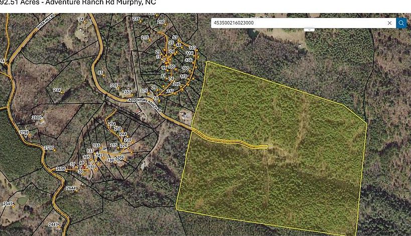 92.51 acres. First Time on the Market! Development Potential. Cherokee County Land. 21.8 miles from downtown Murphy. Beautiful wooded property with partial paved road through the center of the property giving road frontage on both sides (see aerial overview). This property is ideal for a sprawling private estate, magnificent private and secluded mini estate tracts, or multiple wooded building lots. Twin gated communities would also be possible! Excellent development potential with privacy and seclusion. The land consists of mostly buildable land, old logging roads, various types of hardwood trees, dogwoods, three natural springs, and the creek, enhancing both beauty and value, which winds along the paved road. Please call for additional information or to arrange a tour of this truly special opportunity.