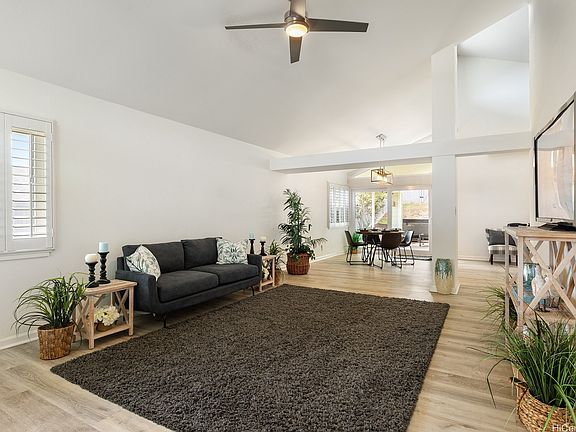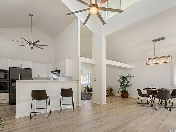 Elegant and spacious single level 3 bedroom 2 bath home located in upper Makakilo with over 6,000 square feet of land and spacious front and back yards with newer vinyl fence for privacy and pets. Enjoy the vaulted ceilings and all new windows throughout which provide ample natural light and boast plantation shutters. This home features a remodeled kitchen with hardwood cabinets, pull-out pantry shelves and soft close doors, quartz countertops and newer appliances. The open kitchen design includes bar top seating as well as a separate breakfast nook. The Primary suite is spacious with luxury vinyl plank floors and Corian finishings complete the new accessible shower in the en suite bath. Two guest rooms share a guest bath and are carpeted. Throughout the home you'll find split A/Cs in the living room and bedrooms, Luxury Vinyl plank flooring, fresh paint, newer windows and sliding doors, new closet doors and an asphalt shingle roof was installed in 2019. This home gives meaning to the phrase turnkey! Relax under your large covered lanai, enjoy gardening around the property, long soaks in your hot tub and the easy maintenance of an epoxy floor.