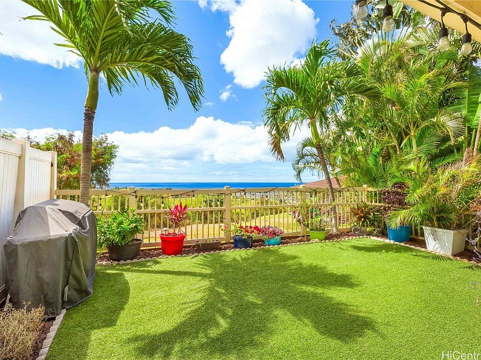 Welcome to your retreat! Located at the much sought-after Ocean Ridge at Makakilo. This stunning property is a desirable and rare end unit on a cul-de-sac. It has an unparalleled lush landscape and ocean views that will take you away. Ocean views from all rooms in the house. Relax in the generous backyard and enjoy the breezy trade winds and views stretching from Diamond Head to Ko Olina. This home reflects modern luxury and convenience. The home enjoys an open-concept kitchen featuring refurbished sleek shaker cabinets, exquisite new quartz countertops, and new stainless-steel appliances. The kitchen includes new cabinets for added storage and a coffee bar. This home has upgraded flooring, baseboards, and screens on all windows. Stay cool & comfortable year-round with four strategically placed split AC units. 4 parking spaces (two garage, two driveway) & 16 guest parking stalls. Don't miss out on this remarkable property!