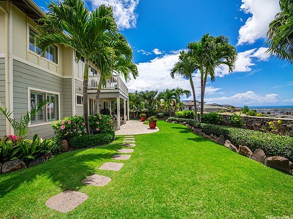 Welcome to 92-782 Kuhoho St, a beautifully upgraded two-story home located on a quiet dead-end street in Makakilo-Kahiwelo neighborhood. Situated on a large lot, this one-of-a-kind property offers stunning ocean, coastline, and sunset views from every room in the home. The main level features a bedroom and full bathroom, along with an open-concept kitchen, living, and dining area that seamlessly flows out to a spacious lanai- perfect for enjoying indoor-outdoor island living. Step outside to take in the incredible landscaping across four terraced levels, with vibrant greenery, fruit trees (Valencia orange, papaya, banana, tangerine, lemon, and lime), and beautiful retaining rock walls. Pride of ownership shines throughout with tile flooring, central AC, plantation shutters, and appliances just 1-2 years old. Energy efficiency is built in with 28 owned PV panels on net metering. A concrete pathway leads from the front of the home down through the lush backyard, making every inch of this property accessible and enjoyable.