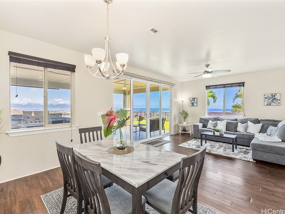 This RIM LOT home WITH EXPANSIVE VIEWS OF THE OCEAN AND MOUNTAINS, as well as the peaceful open setting of the yard and patio deck provides a tranquil setting that is unforgettable! Many upgrades were made to this home such as an extended side driveway which is gated enhancing security and privacy, owner’s suite lanai giving an extra 375 sq ft of living space upstairs and downstairs including a patio with built-in gas grill, granite counter and stainless steel sink, remodeled the ½ bath and improved the primary bathroom, has owned 24 PV panels on a net metering system which significantly reduces energy costs, new carpet installed in 2021, added luxury vinyl plank floors to all of the bathrooms, has a NEST thermostat for efficient climate control and fresh paint inside and out! The inside keeps cool with central AC! This home combines luxury with practical updates, making it not only a beautiful place to live but also a smart investment. If you’re considering making a move, this property’s features and setting offer a blend of comfort, convenience, and stunning views.