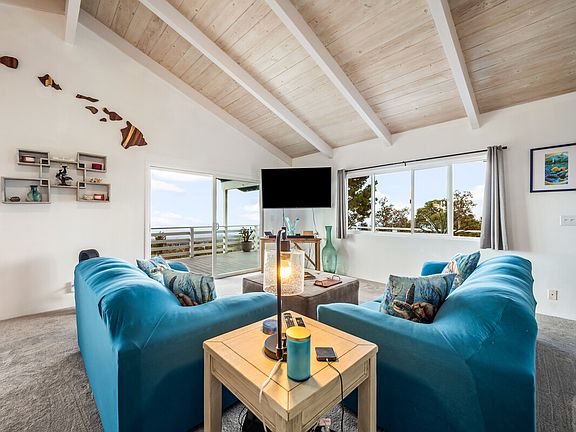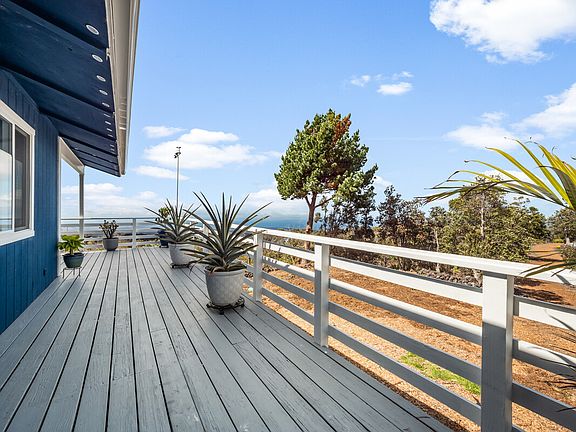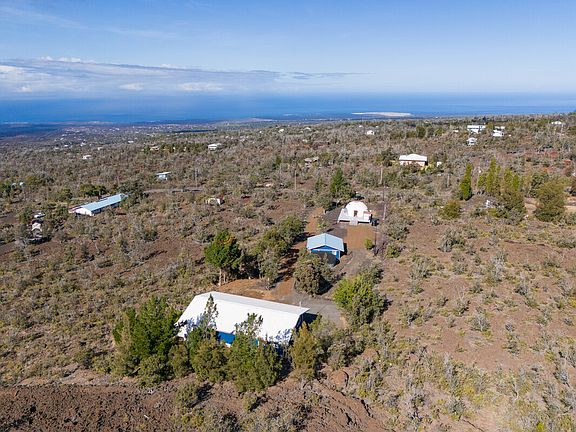 Nestled on the picturesque side of Mauna Loa at 3000 feet where the temperatures are delightful, this move-in ready property boasts a panoramic view of South Point's rugged coastline and vast ocean views. The main residence features open living spaces that seamlessly blend with the natural surroundings. Highlighting the property is a wrap-around deck, offering the perfect outdoor sanctuary for relaxation, entertainment, or simply basking in the breathtaking vistas at sunrise and sunset. The detached two-car garage includes shelving and a workbench.