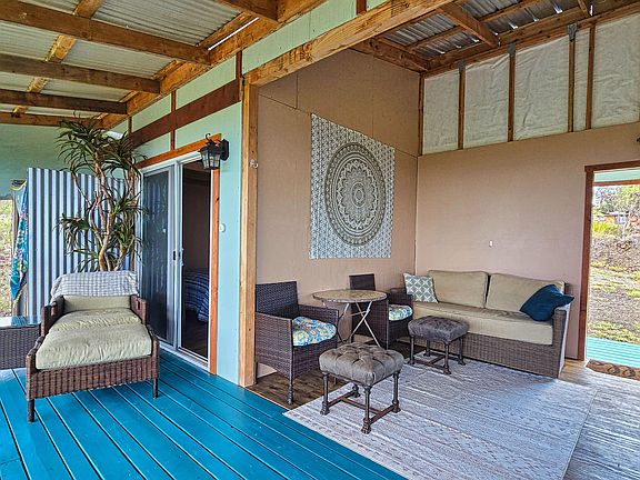 Set on a 1-acre property at 2,200' elevation, just a few blocks from Highway 11, the home includes approximately 640 sq ft of covered living space (16' x 40'). The open-air kitchen and living area extend into a screened lanai, perfect for relaxing, dining, or taking in ocean views and colorful Hawaiian sunsets.