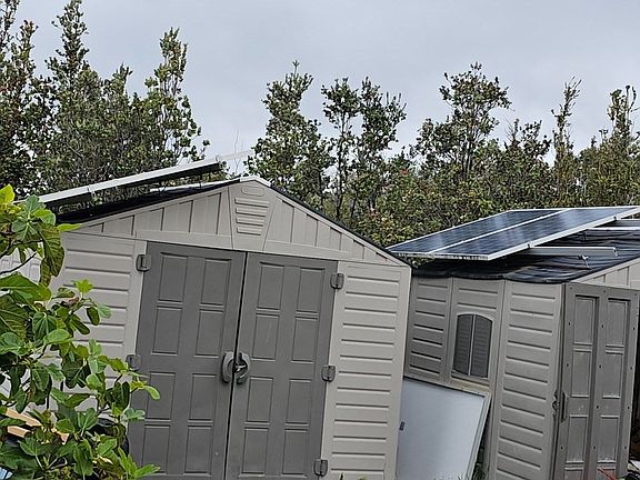 Country Living in HOVE. Up a long-wooded driveway is a very quaint little one bedroom one bath cabin on one acre. Incredibly quiet and peaceful living at the higher elevation allowing for much cooler temperatures during those warm hot days. The utility shed includes the pressure tank, pump, generator, invertor, and 24-volt batteries. The generator runs on gas or propane. The five solar panels are attached to two additional storage shed roofs bringing power to the cabin. There is an outdoor washer and dryer, propane tank included. There are two water resources; rain gutters collecting rainwater into a nearby tote (approx 300) gal) and a 2,500 gallon catchment water tank system. High speed internet serviced by Hawaiiantel is free indefinitely*. The kitchen includes a full-sized gas stove, 24v refrigerator, stainless steel double sink. Conveniently equipped with a full bathroom with vanity, shower and toilet, open living area and bedroom. The cabin is located at the back end of the property. The structure is approximately 500 square feet on the southwest portion of the property at about 3,400' elevation. The lot dimensions are 122'x356'. As you reach the end of the driveway lined with a rockwall, there is a nice open space for your potential housepad. The property has a few beautiful tall evergreen trees but mostly ohia. Nicely landscaped, plenty of room for your garden beds and much more. This is a nice wide square lot; the 2nd lot from the corner.