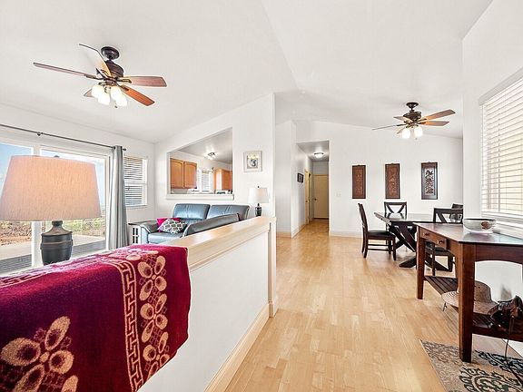Laminate flooring in the kitchen, dining area and living room, Tile floors in the bathroom and carpet in the bedrooms.