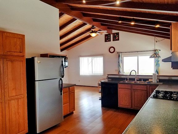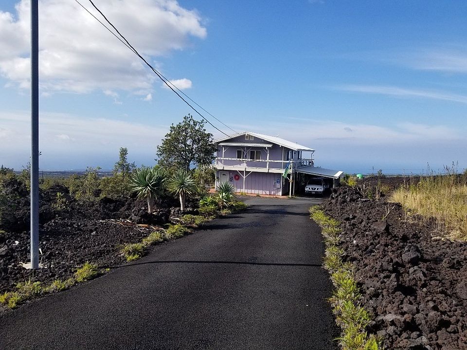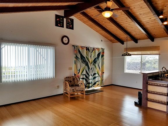 This home has it all, designed for open bright island-style living. The huge kitchen opens to the dining area and living room with expansive South Point coastline sunset views. Open beam throughout the house provides tropical airflow along with windows on all sides. Beautiful bamboo floor, with cork flooring in the bedrooms, ornamental stained glass, whirlpool tub in the master bathroom. Enjoy entertaining with a large lanai deck and wraparound walkways for evening stargazing or barbeque dinners. Downstairs has its own entrance, and also access to upstairs with an enclosed staircase. The separate downstairs unit has 2 bedrooms, a full bath, and a living room area with a covered porch area. Great for extended family or guests. In addition, there is an enclosed man cave with tons of storage for tools, room for all the watersport equipment, you are going to love the storage. Carport for 2 vehicles. This house has a warm welcoming energy and has been the family's well-maintained vacation home. It's peaceful, set back off the road with a long paved driveway. The neighbors all are friendly and show pride in ownership. The sellers own TMK:3-9-2-12-71 adjacent left-acre lot. With a full-price house offer, the Seller will sell the vacant for $12,000. The Sellers to assign their maintenance agreement with "Sunrun" and provide proof of paid off lease for the use of solar system with guaranteed output through 1/21/35" Zero net, approx $20/month electric bill. New 80 gal Rheem water heater installed. Propane gas cooking range. & dryer, 8,000 gal galvanized water catchment tank is located at the back of the lot and has a fill-up valve closer to the house for delivery if needed for water. The house is partially furnished. The yard has irrigation with timers to beautiful Koa, bananas, dragon fruit, succulents & palms. Owner builder attention to details, 4 ft overhang, much family love put into this hale. Driveway has a signal alarm to let know when visitors arrive. Family Perfect