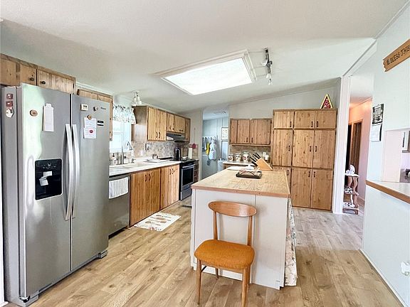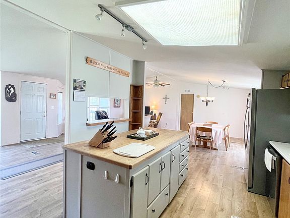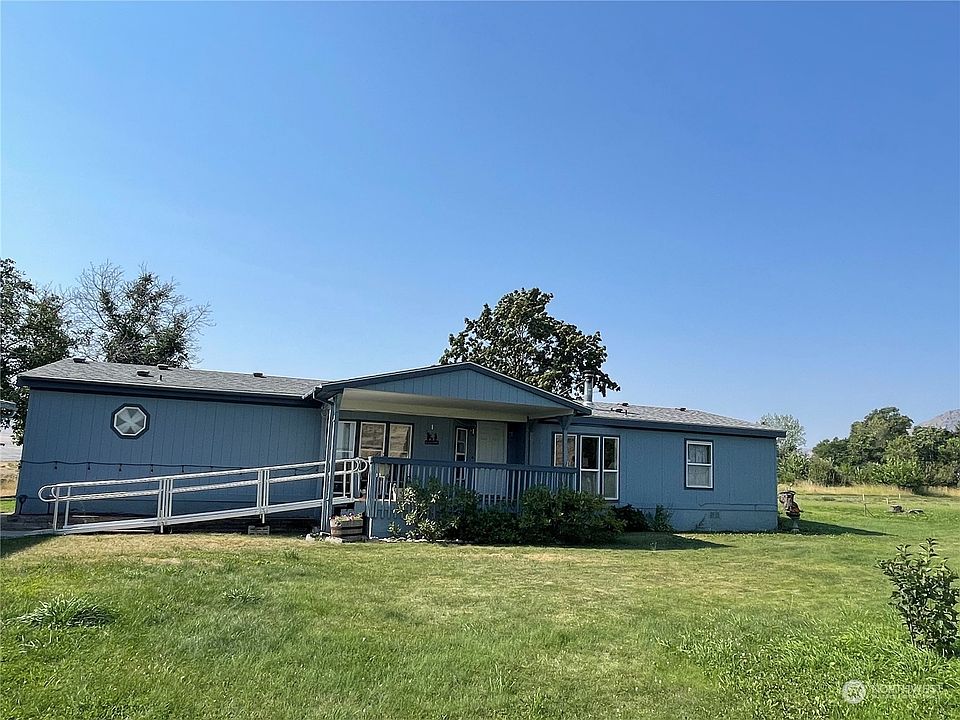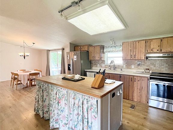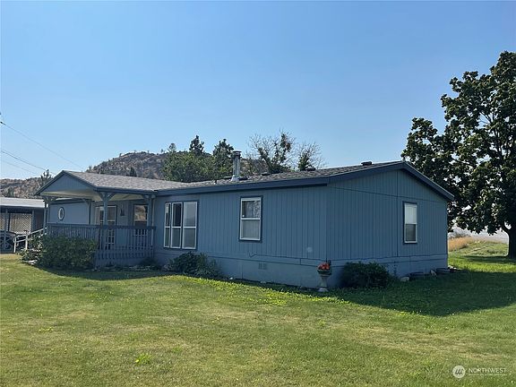 Okanogan - Beautifully maintained 1960sqft 3 Bed/1.75 Bath Manufactured Home on 4 acres! Wonderful view of the golf course, mountains, and surrounding landscape. Enter into living room, custom cabinet kitchen & center island, dining room, wood burning fireplace, laundry room w/ample storage & utility sink, two bedrooms, one full bath, and primary with immaculate remodeled en-suite. Covered deck off dining room with beautiful views for entertaining! Detached carport - two vehicle parking. Outbuildings include: 720sqft carport, 462sqft shop, 192sqft shed, and 345sqft equipment shed. Raised garden beds, cherry trees, walnut tree, plum, nectarine, and peach tree. Progressive Domestic Water. Septic. OID. $364,900 MLS-2271366/H-3586