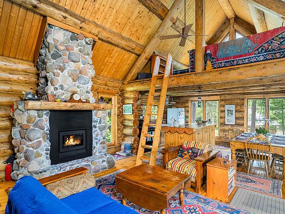 Hand-hewn log cabinCharming bunkhousePine floorsLarge sleeping loftsPristine shorelineSpacious ground-floor primary bedroomWarm rustic ambiance