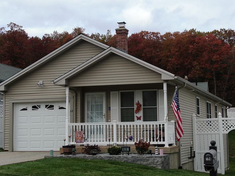 This young, JUST LIKE NEW Single Detached Ranch-Style Condo offers the perfect blend of modern amenities with style, and convenience in a desirable Active Adult Community. The Open Floor Plan makes it easy for entertaining and gatherings. This inviting unit includes two spacious Bedrooms and two updated Bathrooms, providing a bright and easy flow throughout. Enjoy the Beautiful Hardwood Floors that add warmth throughout. The modern Kitchen features solid oak cabinetry, newer granite countertops, tiled backsplash, a center island, a deep sink, new faucet, and new appliances with quality finishes. Both bathrooms have been tastefully updated with contemporary fixtures and include a 1st floor Laundry. Enjoy breathtaking panoramic views from your front porch and wake up with morning coffee in this peaceful environment. The unfinished walk-out Basement provides excellent potential for Future Living space, a Gym, or a Hobby area. There is a one car attached Garage with opener, Central Air Conditioning, 330-Gal Oil Tank, designed for low-maintenance Living, this home lets you enjoy an active, friendly community with a welcoming atmosphere and includes a community center too. Experience easy living, modern updates, and a serene setting all in one beautiful home.
