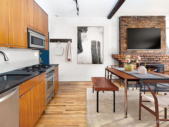 The apartment is bursting with charm and pre-war details, highlighted by the original, functioning wood burning fireplace and exposed wood beams. There is a modern kitchen with stainless steel appliances, a spacious bedroom and wonderful closet space.