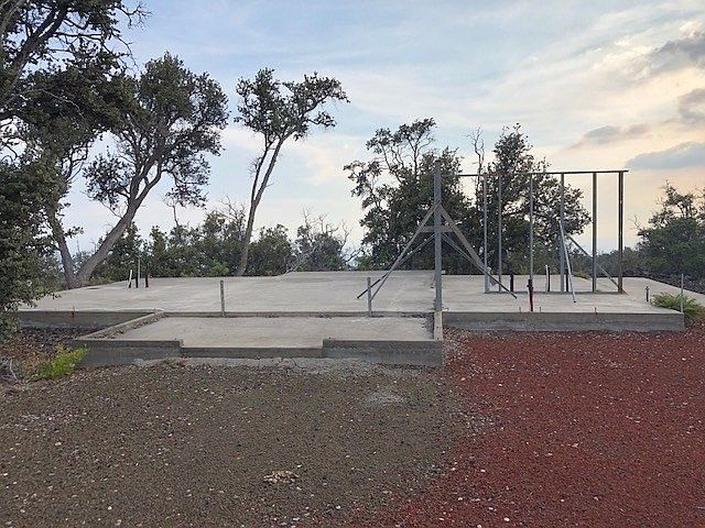 PARTIALLY BUILT AND THE HARD WORK HAS BEEN DONE You have a great opportunity to make your vision into reality by being able to complete a home that was carefully designed and construction has begun on this custom designed 2 bedroom 2 bath home with a fireplace and lanai to enjoy lovely OCEAN VIEWS. INCLUDED ARE ORIGINAL plans, on site/off site improvements with a driveway, concrete slab, some roughed in plumbing, electrical and cesspool (which was installed prior to the county requirement of a more expensive septic statement which may be grand-fathered in). Permits have been pulled and may be transferable. THE SLAB HAS BEEN POURED on the property which houses a catchment tank partially installed and could service as a work shop and/or enclosed covered parking for one vehicle or one could just stay there while completing the home. Some building materials have been stored on site included and in adjacent storage building . This home was originally designed as a steel framed home which is greatly appreciated in Hawaii where termites are a big worry or could possibly be converted to an all wood framed home should one desire with just a few tweaks to the plans. LOCATION, with this in mind, one can enjoy the wonderful sunrises and sunsets that this home offers for all your indoor/outdoor living and just walking distance to the two shopping centers. By being a corner lot it gives you even more open space on your 3 acre parcel. There are some trees and shrub already mature on the property for shade. YES, take advantage of this OPPORTUNITY to build your dream home at a reasonable price instead of having to pay retail. There is a constant temperature of approximately 75 degrees for 365 days of the year at this property. Not too much rain but just enough so there are many sunny days and balmy star studded nights with great trade winds most of the time. Become a CONTRACTOR/BUILDER AND FINISH THIS CUSTOM HOME. GREAT BUY next to 92-8635 Maile Dr.
