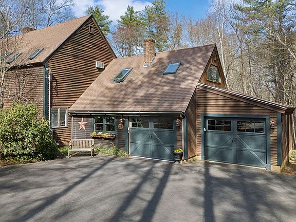 Step into this beautifully designed contemporary home featuring rich wide plank hardwood floors that flow seemingly through the living space. The warmth of natural wood ceilings adds character and charm, perfectly complementing the home's sleek modern lines. Enjoy the cozy ambiance of not one, but 2 fireplaces. Recent updates include 9 new Anderson windows and 12 solar powered Velux skylights with integrated blinds that flood the home with natural light. Equipped for comfort and efficiency, this home includes brand new mini split AC units and high efficiency heat pump system for heating and cooling installed in 2025. The spacious layout includes 3 bedrooms, a dedicated office and a partially finished basement. A perfect blend of style and comfort, this home is ideal for those who appreciate modern design paired with timeless, organic materials. Enjoy serene views from the sunporch, showcasing a professionally landscaped yard, offering year-round beauty.