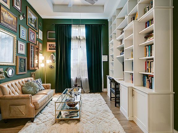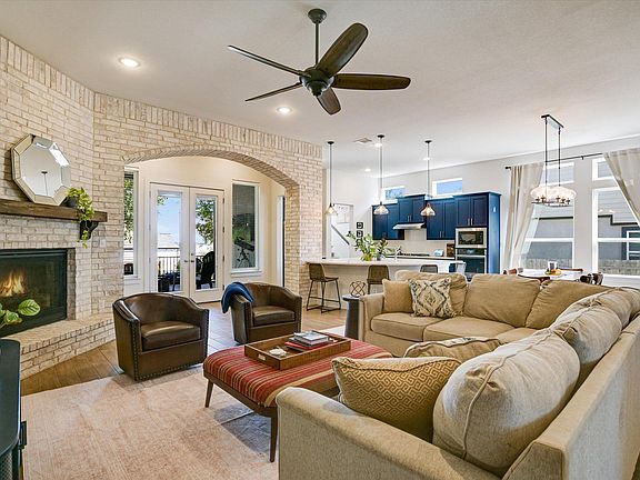 Cozy fireplaceIron fenceQuartz countersCovered patioLarge islandSpacious primary suiteNavy cabinetry