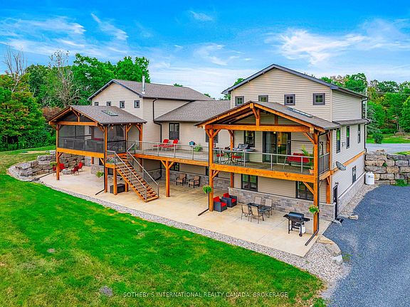 Set in the sought-after community of Ivy Lea, this custom-built estate blends luxury, practicality, and family comfort. Built just 10 years ago, it offers exceptional attention to detail and a design perfectly suited for multi-generational living. At its heart is a grand, light-filled main living area with soaring proportions - an inspiring space that easily showcases fine art while serving as the perfect gathering place for holidays and celebrations. The home features three self-contained suites, each designed with independence and comfort in mind. The secondary suite includes its own private one-car garage, while the lower-level suite boasts a private entrance, heated floors, and a personal gym. Outdoor living shines with expansive decks overlooking a tranquil setting, where wildlife visits the pond and lawn daily. With entrances off the 1000 Islands Parkway and Reynolds Road, the property is ideally located between Ottawa, Montreal, and Toronto, and only minutes from the U.S. border. Practical features include a heated three-car garage, a state-of-the-art geothermal system, and two propane generators for seamless backup power. Balancing sophistication with warmth, this estate offers a rare opportunity to own a true legacy property in the 1000 Islands.